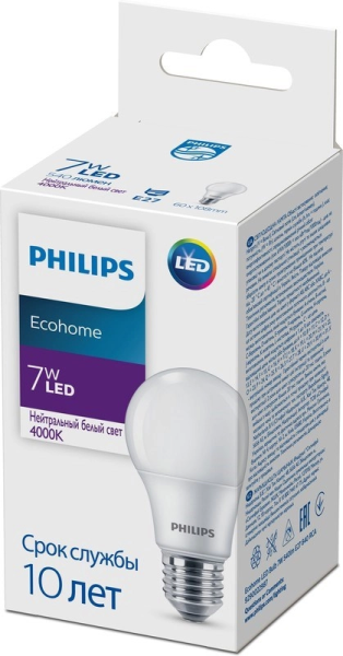 Philips Ecohome LEDBulb 7-65W E27 3000K 220V A60 500lm LED 929002298617 светодиодная лампа